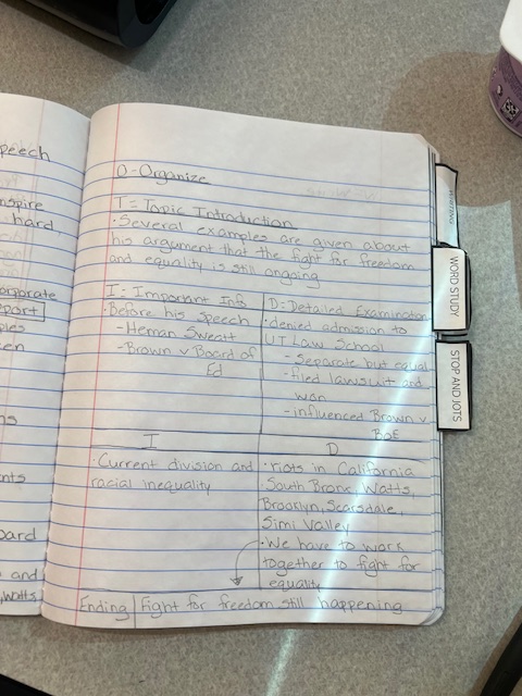 P3: This step involves us picking ideas to write about based on what the prompt is asking us. I did have to guide my students a little bit to make sure that they were hitting the chronological order aspect, but they did extremely well with this part. We talked about events that happened before the speech, and events that were currently happening in the fight for equality.